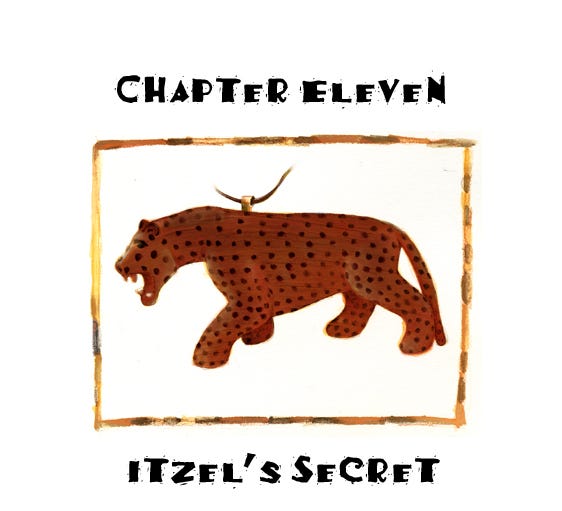 Itzel put her finger to her lips, motioning for Max to come with her. He followed her, past the cabins, past the granary, past the Great House, to the edge of the forest. There, at the base of a large ceiba tree, Itzel sat down and let the cacao pods tumble to the ground. Max sat down opposite her. Leaning against the tree, she reached into her mochila and took out a handful of what looked like nuts, or maybe fruits, Max couldn’t tell. She offered him some. He turned the curious fruit around in his fingers. About the size of a small apricot, it was round, firm, and had a thin orange skin that smelled of citrus.